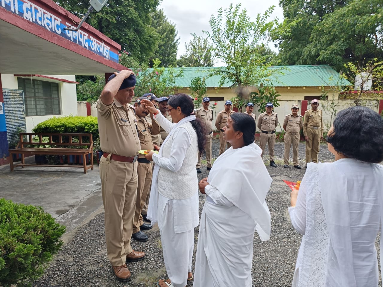अल्मोड़ा आज दिनांक 11.08.2022 को रक्षाबन्धन पर्व के अवसर पर *प्रजापति ब्रह्मकुमारी ईश्वरीय विश्वविद्यालय माउण्टआबू राजस्थान की द्वाराहाट शाखा* की बहनों द्वारा थाना द्वाराहाट में आकर *थानाध्यक्ष राजेन्द्र सिंह बिष्ट* एवं थाने के समस्त स्टाफ को राखी बांधकर उनका मुंह मीठा किया गया और उनकी लम्बी उम्र की कामना करते हुए इसी लगन एवं निष्ठा से बहनों एवं क्षेत्र की जनता की रक्षा करने के लिये प्रेरित किया।