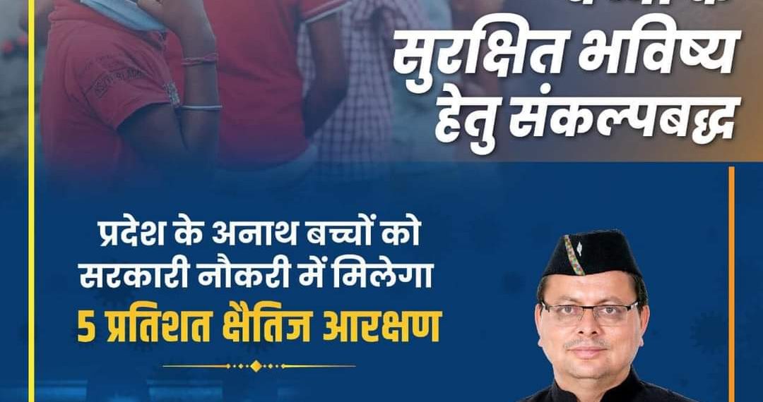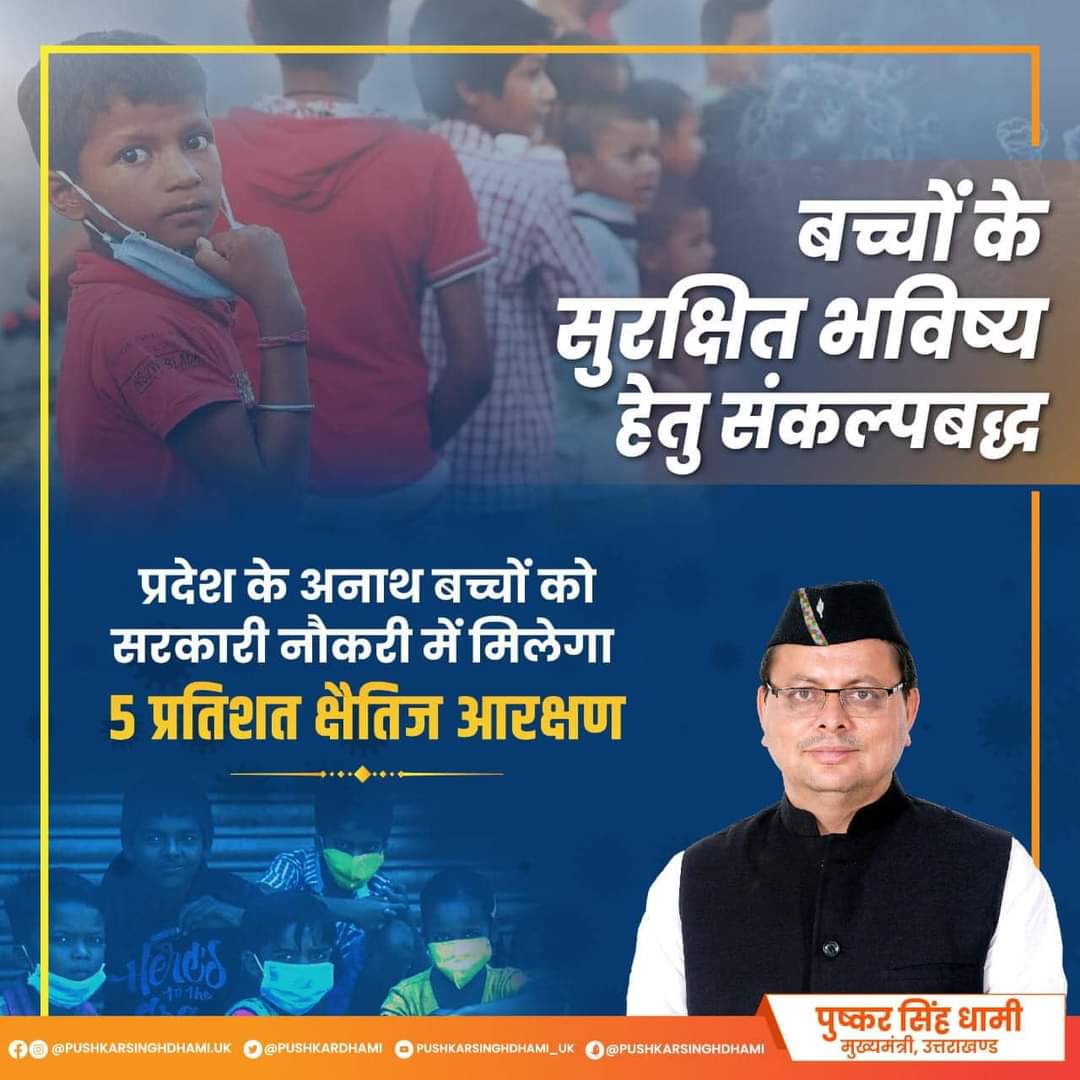 उत्तराखण्ड सरकार ने तय किया है कि राज्य का ऐसा कोई भी युवा, जिसकी आयु 21 वर्ष से अधिक है और जिसके माता-पिता दोनों का पूर्व में निधन हो गया है उन्हें सरकारी नौकरी में 5% क्षैतिज आरक्षण दिया जाएगा। ऐसे सभी बच्चों के लिए सरकार स्वयं अभिभावक के रूप में दायित्व निभाएगी।