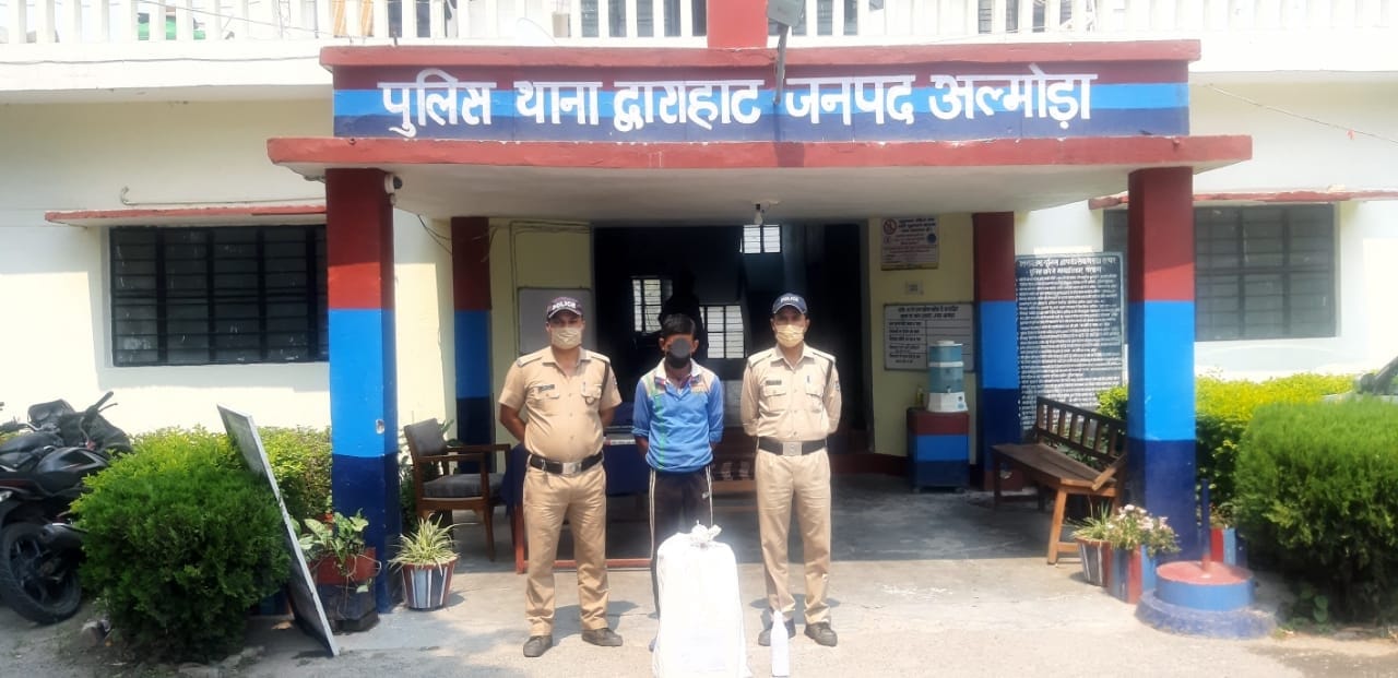 द्वारा अवैध मादक पदार्थ तस्करी करने वालो के विरुद्ध कार्यवाही करने सख्त निर्देश पर आज दिनांक 07.05.2022 को थाना द्वाराहाट की पुलिस टीम *उ0 नि0 निखिलेश बिष्ट प्रभारी चौकी बग्वाली पोखर, कानि0 कुन्दन गिरी* द्वारा चैकिंग के दौरान बग्वालीपोखर से अल्मोड़ा को जाने वाली सड़क में ग्राम बासुलीसेरा मे खरेटी के पास एक व्यक्ति *दीपक सिंह नेगी उम्र करीब 36 वर्ष पुत्र स्व. गंगा सिंह नेगी निवासी ग्राम व पोस्ट रतगल तहसील रानीखेत जनपद अल्मोड़ा के पास से 02 पेटी (24 बोतल) कीमत 10,000 रु0* की अवैध देशी शराब बाजपुर मार्का बरामद की गई । उपरोक्त व्यक्ति को गिरफ्तार कर थाना द्वाराहाट में 60 आबकारी अधि0 में अभियोग पंजीकृत कर आवश्यक कार्यवाही की जा रही है ।