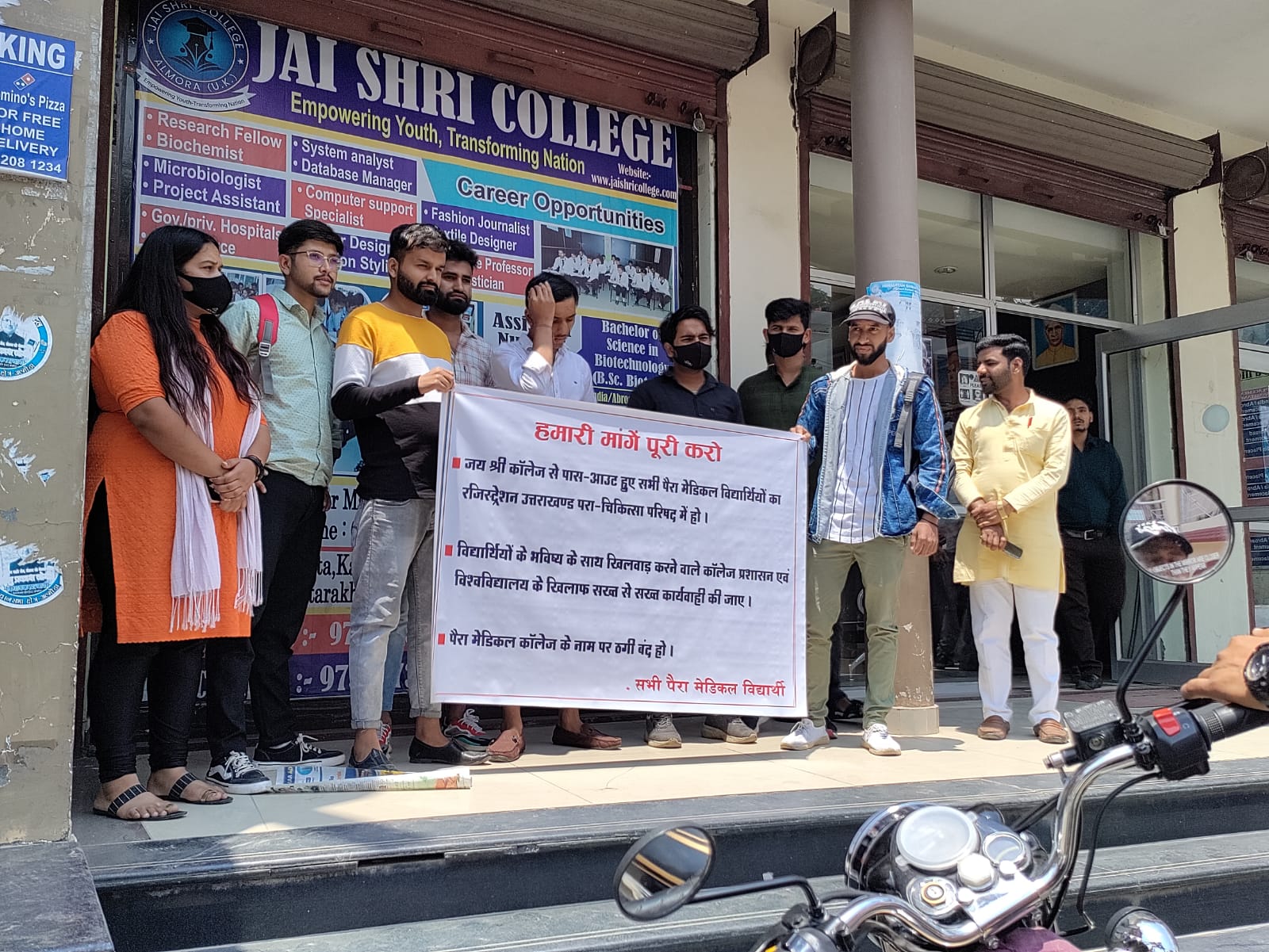 दरअसल, बीते दिनों यहां लोअर मालरोड स्थित जय श्री इंस्टीट्यूट में फर्जी डिग्री का मामला प्रकाश में आया था। छात्रों और अभिभावकों की शिकायत के बाद पुलिस ने संबंधित कॉलेज प्रबंधक के खिलाफ मुकदमा दर्ज किया था। इधर, शुक्रवार को इंस्टीट्यूट पहुंचे पैरा मेडिकल के छात्र-छात्राओं ने कहा कि पूर्व में जिला प्रशासन को संयुक्त रूप से शिकायती पत्र देकर उनके भविष्य से खिलवाड़ की शिकायत की गई थी। इसके बाद मार्कशीट हिमालयन गढ़वाल यूनिवर्सिटी के नाम की दी। यूनिवर्सिटी की ओर से उत्तराखंड पैरा चिकित्सा परिषद से मान्यता के लिए आवेदन नहीं किया गया है। छात्रों ने कहा कि अब उनके अपने भविष्य की चिंता सताने लगी है। वहीं अब भी पैरा मेडिकल काउंसिलिंग में पंजीकरण नहीं हो सका है। जिसके चलते छात्रों की डिग्री तक नहीं आई है छात्रों ने कहा कि अगर जल्दी से इसका निदान नही किया तो करेंगे जल्द आंदोलन। प्रदर्शन करने वालों में सोनी जोशी, कुलदीप गुप्ता, राजेंद्र बिष्ट, रविंद्र पाल, मोनू सिंह, अशोक, पवन मेहता, सागर कुमार, राहुल कुमार, पवन भट्ट, मनोज सिंह नेगी, नीरज टम्टा, पंकज भट्ट आदि छात्र-छात्राएं शामिल रहे।
