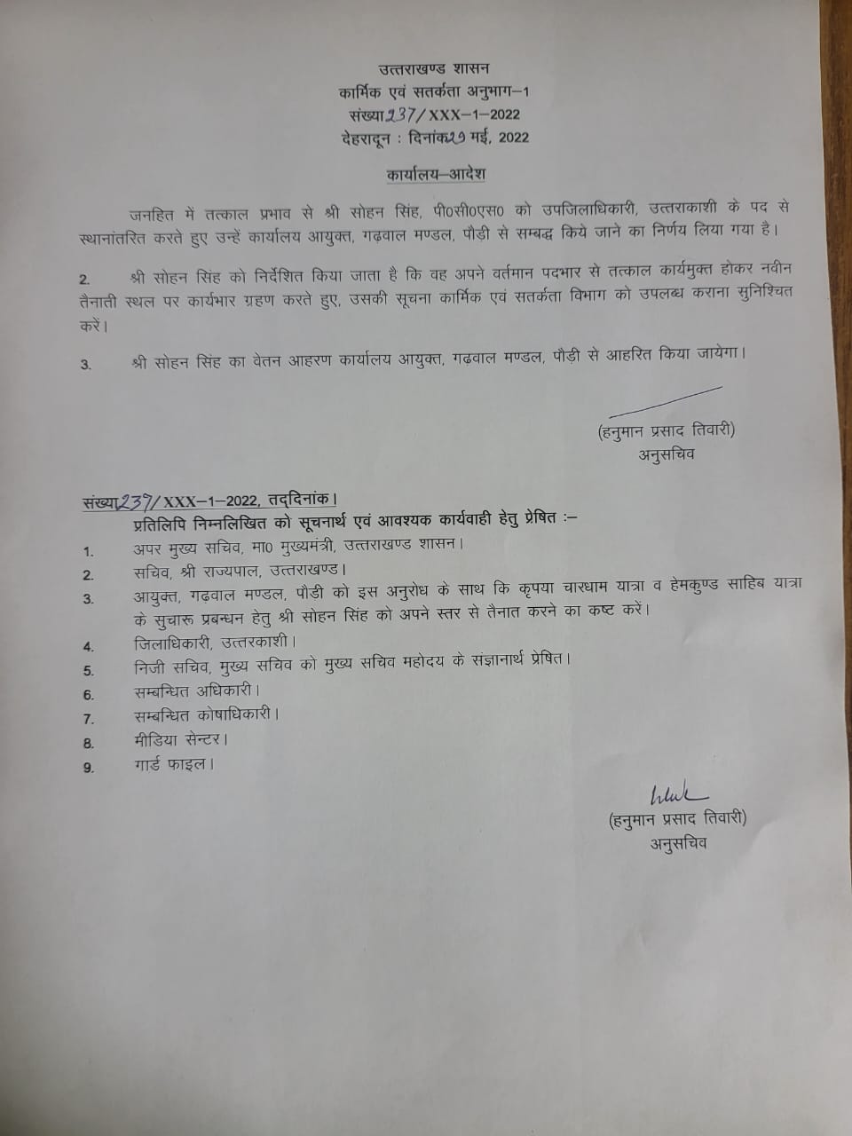 राज्य में तबादले को लेकर एक बड़ी खबर उत्तरकाशी से सामने आ रही है यहां पर जनहित में तत्काल प्रभाव से सोहन सिंह, पी०सी०एस० को उपजिलाधिकारी, उत्तरकाशी के पद से स्थानांतरित करते हुए उन्हें कार्यालय आयुक्त, गढ़वाल मण्डल, पौडी से सम्बद्ध किये जाने का निर्णय लिया गया है।सोहन सिंह को निर्देशित किया जाता है कि वह अपने वर्तमान पदभार से तत्काल कार्यमुक्त होकर नवीन तैनाती स्थल पर कार्यभार ग्रहण करते हुए।उसकी सूचना कार्मिक एवं सतर्कता विभाग को उपलब्ध कराना सुनिश्चित करें।सोहन सिंह का वेतन आहरण कार्यालय आयुक्त, गढ़वाल मण्डल, पौड़ी से आहरित किया जायेगा।