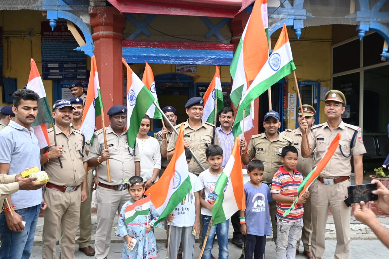 एसएसपी अल्मोड़ा ने स्वयं हाथों में तिरंगा लिए उत्साह और जोश के साथ लगभग 09 किमी0 लम्बी पैदल तिरंगा रैली का नेतृत्व किया*, स्वयं देशभक्ति के नारे व गाने गाकर रैली में सम्मिलित पुलिस बल व रैली को देखने वाले लोगों को भी देशभक्ति के रंग में रंग दिया,* वन्देमातरम् के नारे लगाकर रैली में सम्मिलित पुलिस बल के उत्साह को कम नही होने दिया । सभी लोगो को आजादी के अमृत महोत्सव के शुभ अवसर पर अपने घरों में तिरंगा फहराने के लिए प्रेरित किया