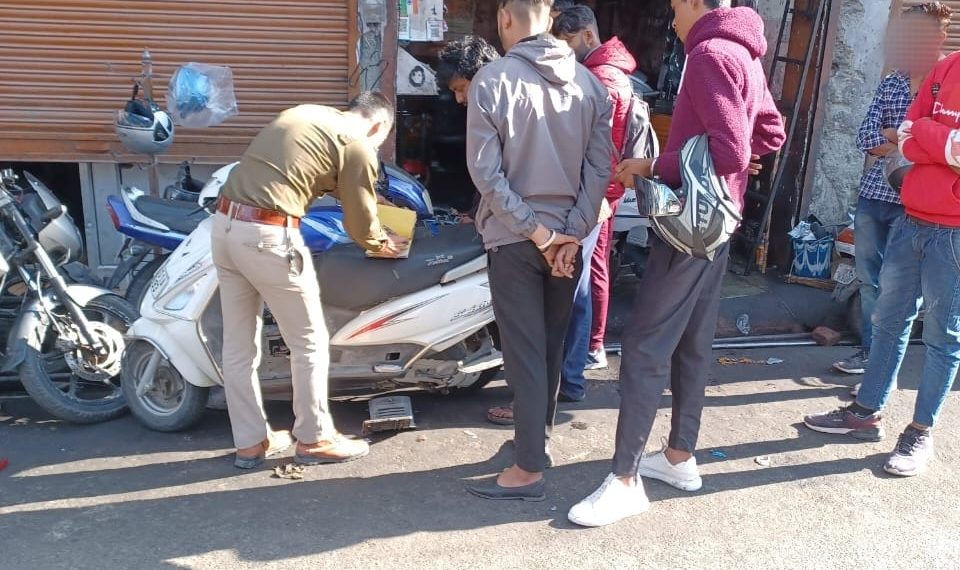 अल्मोड़ा वरिष्ठ पुलिस अधीक्षक प्रदीप कुमार राय, एसएसपी अल्मोड़ा द्वारा दिनांक- 31.10.2022 को नगर का भ्रमण किया गया, इस दौरान माल रोड बक्सीखोला के समीप एक मोटर मैकेनिक द्वारा सड़क पर बेतरतीब वाहनों को खड़ा कर रिपेयरिंग का कार्य किया जा रहा था, जिससे यातायात में अवरोध उत्पन्न होने के साथ ही दुर्घटना होने का खतरा बना हुआ था।एसएसपी अल्मोड़ा ने तत्काल मौके पर इण्टरसेप्टर प्रभारी जीवन सामन्त को मौके पर बुलाकर उक्त मोटर मैकेनिक के विरुद्ध धारा 83 पुलिस एक्ट के तहत कोर्ट चालान की कार्यवाही करायी गयी, साथ ही भविष्य के सजग करते हुए कहा की इस प्रकार का कृत्य न करें। इण्टर सेप्टर प्रभारी जीवन सामन्त द्वारा वाहन के लाउड हेलर से लोगों को जागरुक करते हुए अपील की गयी कि अपने वाहनों को सड़क किनारे नो पार्किग में खड़ा न करें, सड़क पर भवन निर्माण सामाग्री न फैलायें व रेड़ी/ठेड़ी निश्चित जगह पर ही लगायें*।