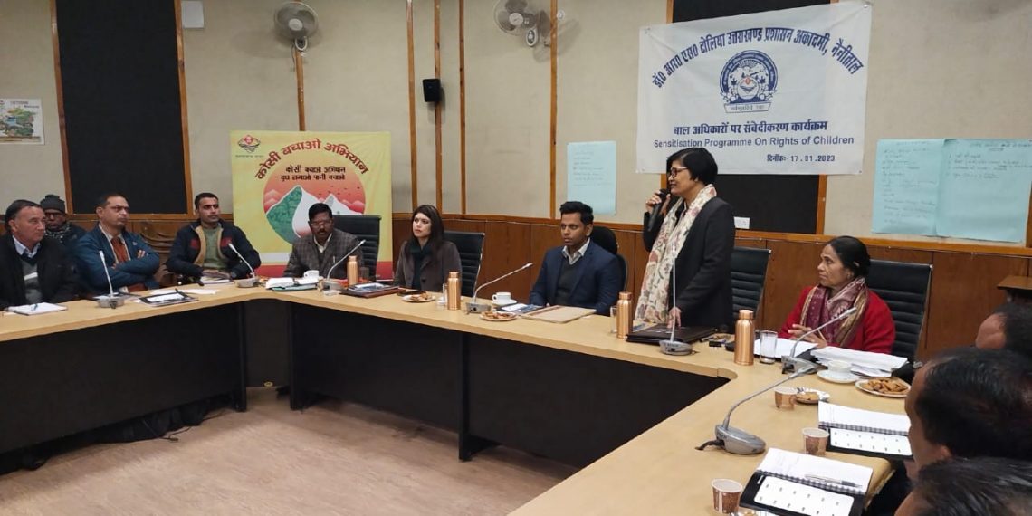 अल्मोड़ा, 17 जनवरी 2023 – डॉ आर एस टोलिया उत्तराखंड प्रशासन अकादमी नैनीताल द्वारा आज विकास भवन सभागार में बाल अधिकारों पर संवेदीकरण प्रशिक्षण कार्यशाला का आयोजन किया गया। कार्यक्रम का शुभारंभ मुख्य विकास अधिकारी अंशुल सिंह, परियोजना निदेशक एवं अन्य ने द्वीप प्रज्वलित कर किया। इस अवसर पर मुख्य विकास अधिकारी अंशुल सिंह ने कहा कि इस ट्रेनिंग का उद्देश्य बाल अधिकारों के प्रति शिक्षा विभाग, महिला एवं बाल विकास विभाग, पुलिस तथा चिकित्सा विभाग समेत अन्य विभागों के अधिकारियों को जागरूक करना है। उन्होंने कहा कि इस ट्रेनिंग के माध्यम से अधिकारी बच्चों के सर्वांगीण विकास में आने वाली चुनौतियों का सामना करने एवं बच्चों को उनके विधिक अधिकार दिलाए जाने के टिप्स प्राप्त करेंगे। उन्होंने कहा कि इस कार्यशाला में सभी अधिकारियों के सुझाव एवं फीडबैक प्राप्त किए जाएंगे तथा उन सुझावों के आधार पर बाल अधिकारों के हितों में एसओपी बनाए जाने में काफी मदद मिलेगी।
