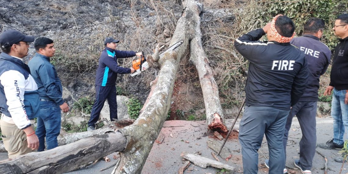 अल्मोड़ा आज दिनांक- 28 /2/23 को समय 17:15 पर फायर स्टेशन अल्मोड़ा में सूचना प्राप्त हुई की लक्ष्मेश्वर कोसी रोड के पास एक पेड़ सड़क पर गिर गया है, जिससे यातायात बाधित हो गया है उक्त सूचना पर फायर यूनिट अल्मोड़ा की टीम तत्काल घटनास्थल पर पहुंची। जहां एक पेड़ सड़क पर गिरा था और पेड़ गिरने से बिजली का लोहे का पोल भी सड़क पर आ गया था।फायर यूनिट अल्मोड़ा की टीम ने लोहे के पोल को आयरन कटर* और पेड़ को उडन कटर से काटकर बाधित यातायात को पूर्ण रूप से सुचारू किया गया। इस दौरान शटीएसआई सुमित पांडे भी मौके पर मौजूद रहे जिनके द्वारा यातायात व्यवस्था को सुचारू कराया गया।