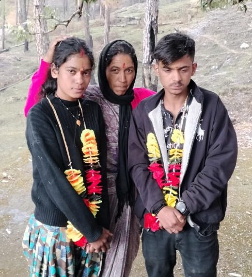 धौलछीना थाना क्षेत्र के गिरचोला निवासी रोशनी बनोला का धौलछीना के कांचुला गांव में ननिहाल है। वह बचपन से ही ननिहाल में रहकर पढ़ाई करती है। उंटिया गांव निवासी कृष्णा सिंह के साथ पिछले एक वर्ष से प्रेम प्रसंग चल रहा था। परिवारजनों से चोरी छुपे दोनों एक दूसरे से मिलते रहते थे। परिवार वालों को पता चला तो उन्होंने शख्ती कर दी। शनिवार को दोनों घर पर बिना बताए कहीं चले गए। युवती ने परिजनों ने शनिवार को काफी खोजबीन की थक हार कर रविवार को युवती के नाना ने पुलिस को गुमशुदगी की रिपोर्ट दर्ज कराई। पुलिस ने तत्परता दिखाते हुए 2 घंटे के भीतर ही दोपहर बाद दोनों प्रेमी युगल को विमलकोट जंगल से सकुशल बरामद कर लिया। थानाध्यक्ष सुशील कुमार ने दोनों के परिजनों को थाने में बुलाकर प्रेमी युगल को काफी देर तक समझाने का प्रयास किया। लेकिन वह किसी भी हाल में अलग होने के लिए तैयार नहीं हुए। इस बीच दोनों पक्षों के काफी लोग थाने में जमा हो गए। पुलिस ने दोनों को उनके परिजनों के सुपुर्द कर दिया। इसके बाद भी प्रेमी-प्रेमिका शादी करने की जिद पर अड़ गए। परिजनों ने प्रेमी युगल को समझाया कि चैत्र मास में हिंदुओं की शादी वर्जित है इसलिए अगले महीने शादी करवा देंगे लेकिन वह नहीं माने। प्रेमी जोड़े की जिद के चलते दोनों के परिजनों ने शादी के लिए सहमति दे दी। बाद में प्रेमी जोड़े ने गांव के निकट गोलू मंदिर में ग्रामीणों की मौजूदगी में एक दूसरे को बरमाला पहनाकर विवाह बंधन में बंध गए। दोनों के परिजनों ने वर-वधू को सुखमय जीवन का आशीर्वाद दिया इसके बाद युवक अपनी नवविवाहिता को अपने घर लेकर चला गया। इस तरह से हुई प्रेमी युगल की शादी क्षेत्र में चर्चा का विषय बना हुआ है।
