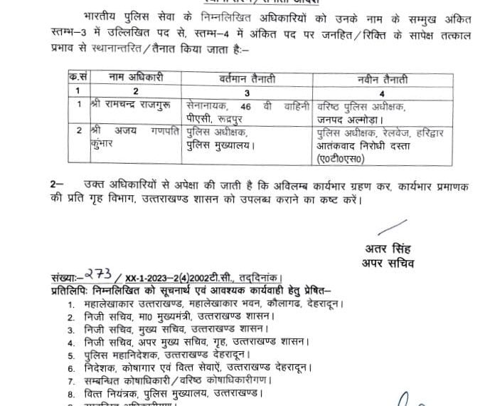 देहरादून 15/5/2023 उत्तराखण्ड सरकार द्वारा पुलिस में स्थानांतरण एवं तैनाती के नये आदेश जारी किए गए हैं अल्मोड़ा की एसएसपी रचिता जुयाल की I B दिल्ली में हुई नियुक्ति नये एसएसपी रामचंद्र राजगुरु बने