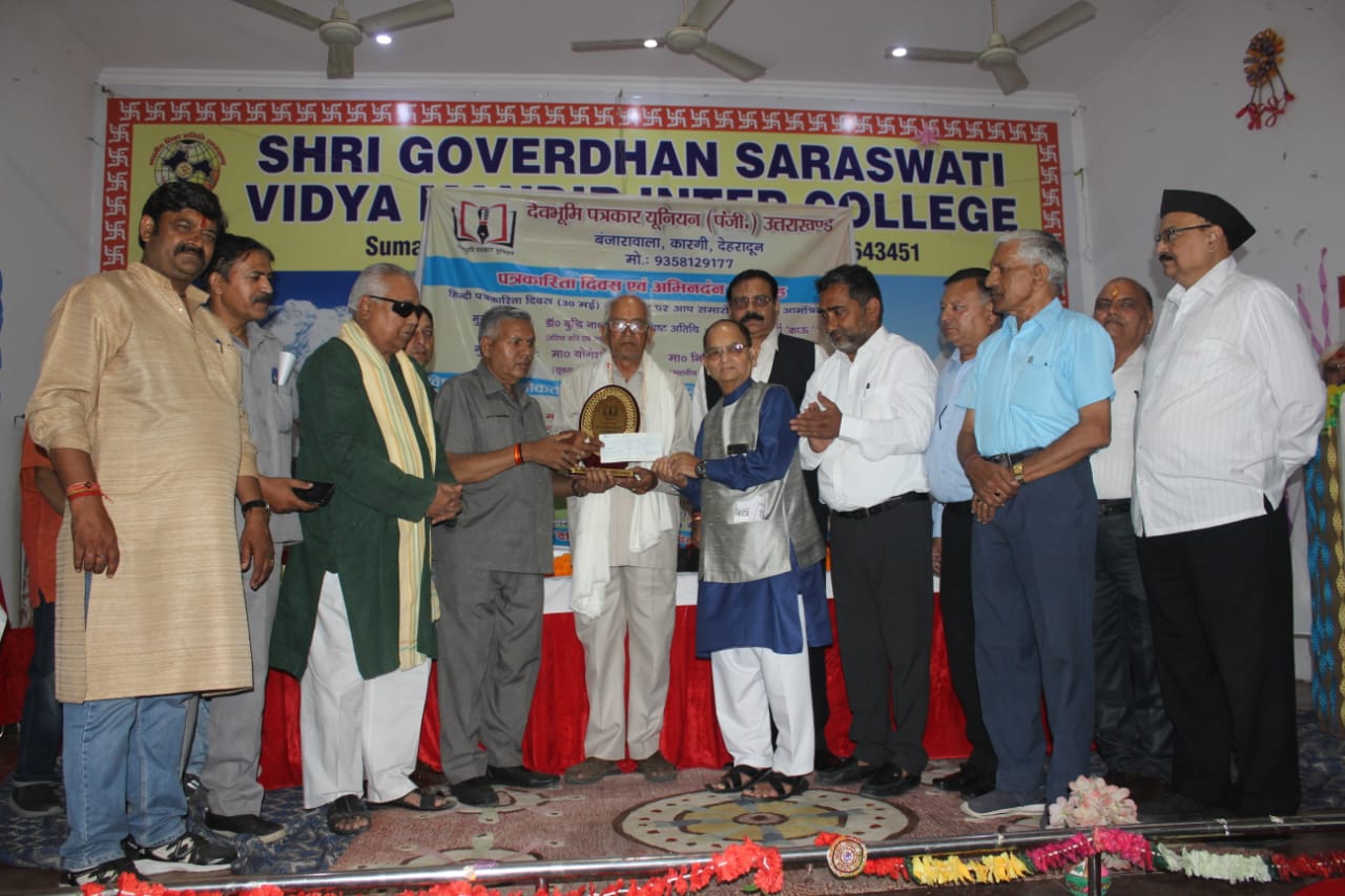 देहरादून, 30 मई। देवभूमि पत्रकार यूनियन, पंजी. उत्तराखंड द्वारा आज सुमननगर धर्मपुर स्थित श्री गोवर्धन सरस्वती विद्या मंदिर इंटर कॉलेज के सभागार में आयोजित पत्रकारिता दिवस एवं अभिनंदन समारोह में “पर्वतीय” समाचार पत्र के संस्थापक स्व. विष्णुदत्त उनियाल स्मृति सम्मान वयोवृद्ध पत्रकार जीतमणि पैन्यूली सम्पादक “पहाड़ों की गूंज” को दिया गया। यूनियन द्वारा इस वर्ष से प्रारंभ उक्त सम्मान पर्वतीय साप्ताहिक के वर्तमान संपादक अजय कांबोज द्वारा 5100 रु. का चेक, स्मृति चिन्ह, तुलसी की माला, शॉल प्रदान कर किया गया। इनके अतिरिक्त पत्रकारिता की क्षेत्र में महत्वपूर्ण योगदान देने वाले नौ पत्रकारों:– अनिल वर्मा (देहरादून टाइम्स दैनिक), कुंवर राज अस्थाना (दिव्य हिमगिरि), रवि अरोड़ा (पछवादून विकास), अजय सिंह राणा (अध्यक्ष उत्तरांचल प्रेस क्लब), श्री सरोजिनी सेमवाल (उत्तराखंड जन), रजनेश ध्यानी (जनपक्ष एक्सप्रेस), रतनलाल लखेड़ा गढ़रत्न मेल), गोपाल सिंघल (अरिहंत एक्सप्रेस), शशिकांत मिश्रा (द नाईट) को स्मृति चिन्ह प्रदान कर सम्मानित किया गया।