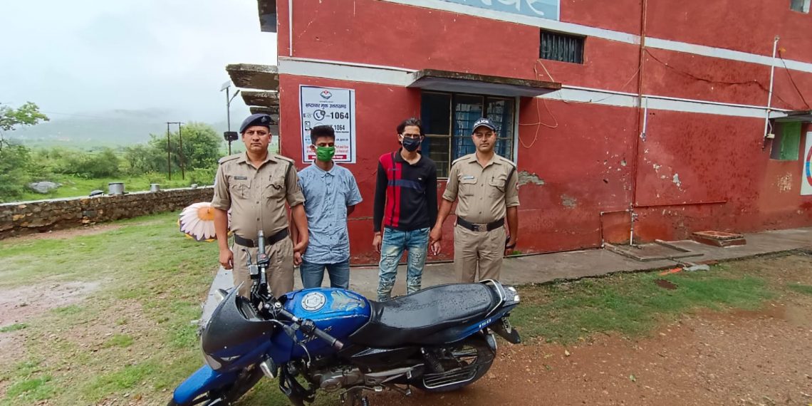 अल्मोड़ा दिनांक 05/07/2023 को वादी अशोक कुमार निवासी ककराड़ पो0 मनान अल्मोड़ा ने थाना सोमेश्वर में तहरीर दी कि उसकी मोटर साईकिल UK01A6068 बजाज पल्सर दिनांक 03.07.2023 को कस्बा मनान से किसी अज्ञात व्यक्ति द्वारा चोरी कर लिया गया है। तहरीर के आधार पर थाना सोमेश्वर में एफ0आई0आर0 पंजीकृत की गई रामचन्द्र राजगुरू एसएसपी अल्मोड़ा द्वारा मामले का तत्काल संज्ञान लेकर थानाध्यक्ष सोमेश्वर को चोरी का शीघ्र अनावरण कर संलिप्त अभियुक्तों की गिरफ्तारी हेतु निर्देशित किया गया । सीओ सोमेश्वर ओशिन जोशी के पर्यवेक्षण में थानाध्यक्ष विजय सिंह नेगी थाना सोमेश्वर* के नेतृत्व में गठित पुलिस टीम द्वारा तत्काल चोरी हुई मोटर साईकिल की खोजबीन शुरु की गई । ठोस सुरागरसी-पतारसी कर पुलिस टीम ने अथक प्रयास से दिनांक 05.07.2023 *मात्र 05 घंटो के भीतर ही चोरी का खुलासा कर 02 अभियुक्तो 1.गौरव रावत 2.गौरव जोशी को चोरी की गई मोटर साईकिल (UK01A6068 बजाज पल्सर) के साथ सोमेश्वर कोसी रोड पथरिया तिराहे के पास से गिरफ्तार* कर पंजीकृत एफ0आई0आर0 में आवश्यक कार्यवाही की गई है। मामले में थानाध्यक्ष विजय सिंह नेगी ने बताया कि दोनों अभियुक्त नशे के आदी है, नशा करने के लिए पैसे नही होने पर दोनों ने मोटर साईकिल चोरी की थी, जिसको बेचकर पैसे अर्जित करने की फिराक में थे ।