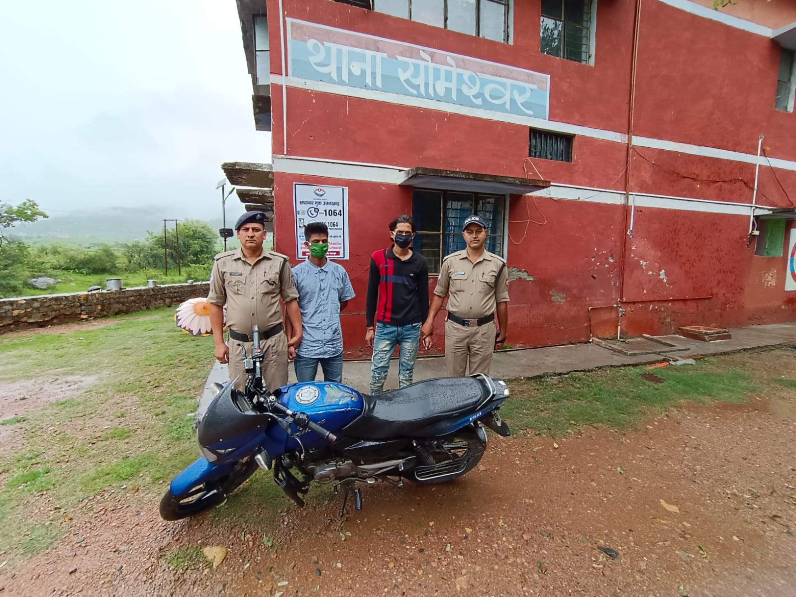 अल्मोड़ा दिनांक 05/07/2023 को वादी अशोक कुमार निवासी ककराड़ पो0 मनान अल्मोड़ा ने थाना सोमेश्वर में तहरीर दी कि उसकी मोटर साईकिल UK01A6068 बजाज पल्सर दिनांक 03.07.2023 को कस्बा मनान से किसी अज्ञात व्यक्ति द्वारा चोरी कर लिया गया है। तहरीर के आधार पर थाना सोमेश्वर में एफ0आई0आर0 पंजीकृत की गई रामचन्द्र राजगुरू एसएसपी अल्मोड़ा द्वारा मामले का तत्काल संज्ञान लेकर थानाध्यक्ष सोमेश्वर को चोरी का शीघ्र अनावरण कर संलिप्त अभियुक्तों की गिरफ्तारी हेतु निर्देशित किया गया । सीओ सोमेश्वर ओशिन जोशी के पर्यवेक्षण में थानाध्यक्ष विजय सिंह नेगी थाना सोमेश्वर* के नेतृत्व में गठित पुलिस टीम द्वारा तत्काल चोरी हुई मोटर साईकिल की खोजबीन शुरु की गई । ठोस सुरागरसी-पतारसी कर पुलिस टीम ने अथक प्रयास से दिनांक 05.07.2023 *मात्र 05 घंटो के भीतर ही चोरी का खुलासा कर 02 अभियुक्तो 1.गौरव रावत 2.गौरव जोशी को चोरी की गई मोटर साईकिल (UK01A6068 बजाज पल्सर) के साथ सोमेश्वर कोसी रोड पथरिया तिराहे के पास से गिरफ्तार* कर पंजीकृत एफ0आई0आर0 में आवश्यक कार्यवाही की गई है। मामले में थानाध्यक्ष विजय सिंह नेगी ने बताया कि दोनों अभियुक्त नशे के आदी है, नशा करने के लिए पैसे नही होने पर दोनों ने मोटर साईकिल चोरी की थी, जिसको बेचकर पैसे अर्जित करने की फिराक में थे ।