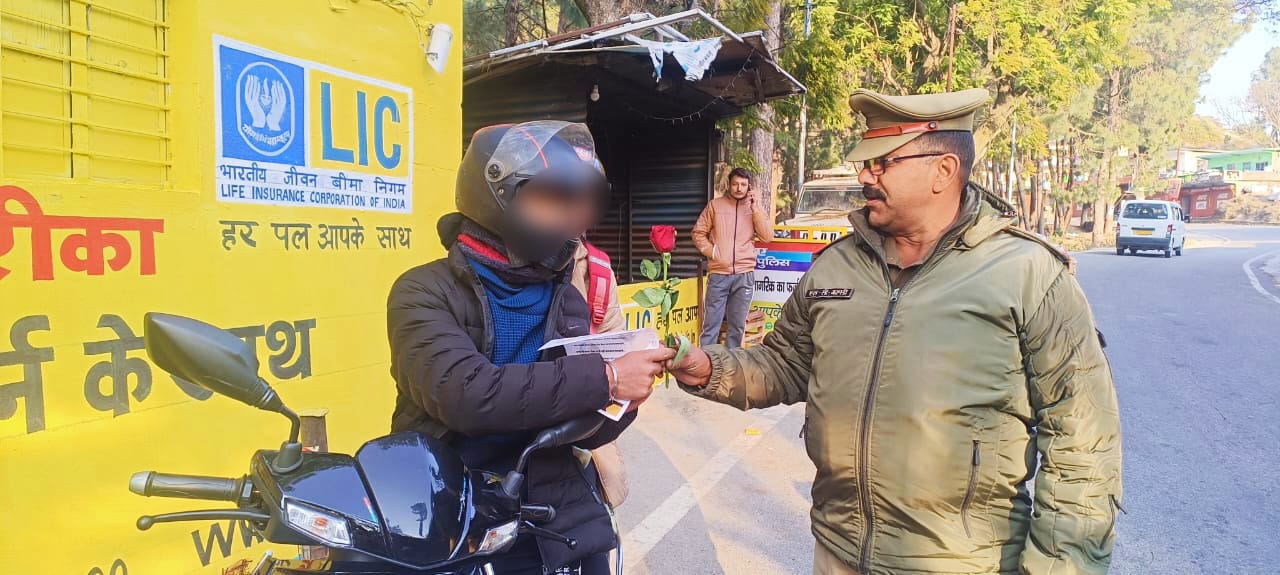 इस क्रम में दिनांक 20/01/2024 को कोतवाली अल्मोड़ा पुलिस द्वारा सड़क सुरक्षा जागरूकता कार्यक्रम आयोजित कर स्थानीय लोगों व वाहन चालकों को सड़क सुरक्षा के प्रति जागरूक करते हुए बताया कि वाहन चलाते समय सभी सुरक्षा मापदंडों व यातायात नियमों का हमेशा पालन करना चाहिए। यातायात नियमों का उल्लंघन करने वालों को गुलाब का फूल देकर भविष्य में यातायात नियमों का पालन करने की अपील की गई। इस दौरान मोटर वाहन अधिनियम के बारे में आवश्यक जानकारी प्रदान की गयी साथ ही वाहन चालकों को शराब पीकर वाहन न चलाने, ओवर स्पीड वाहन न चलाने व वाहन चलाते समय मोबाइल फोन का प्रयोग नहीं करने, दोपहिया वाहन में हेलमेट पहनने, रैश ड्राइविंग नहीं करने के संबंध में जागरूक किया गया और यातायात नियमों व संकेतों/चिन्हों से सम्बन्धित जागरुकता पम्पलेट वितरित किये गये।