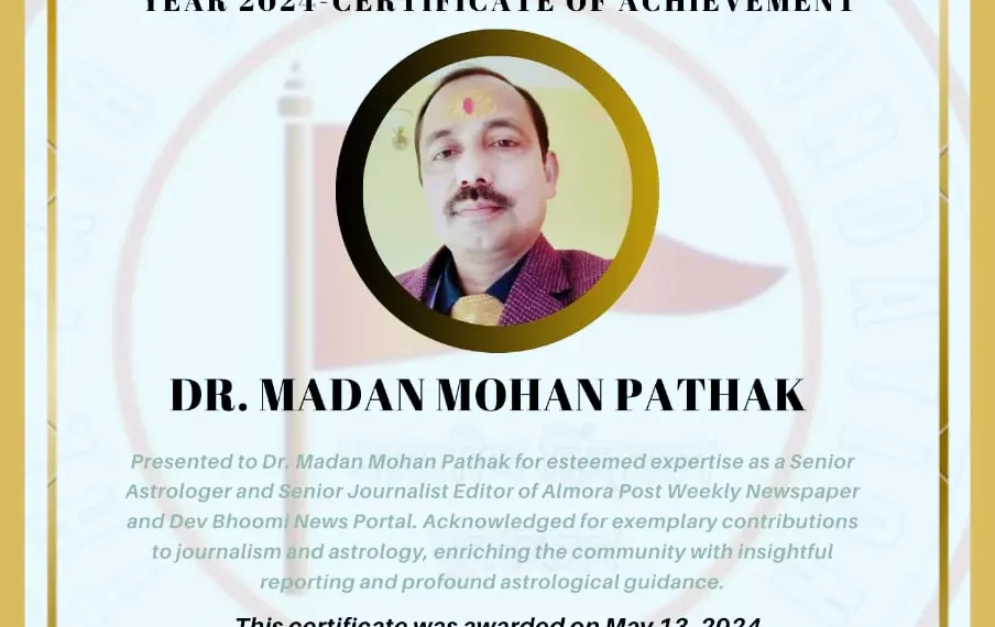 अल्मोड़ा वरिष्ठ ज्योतिषाचार्य, वरिष्ठ पत्रकार संपादक अल्मोड़ा पोस्ट साप्ताहिक समाचार पत्र एवं संपादक देव भूमि न्यूज पोर्टल, इन्हें ज्योतिष और पत्रकारिता के क्षेत्र में किये जनसेवा , अपनी ज्योतिष विद्या द्वारा जनहित के लिए उत्कृष्ट कार्य,और सटीक भविष्यवाणी, धर्म ध्वजा को जन जन तक पहुंचाने, एवं अपने परंपरागत पुरोहित कार्य द्वारा लोगों को सही मार्गदर्शन देने,को लेकर यह सम्मान प्रदान किया है। डाक्टर पाठक को मिली इस उपाधि से क्षेत्रीय जनता एवं उनके चाहने वालों में हर्ष की लहर दौड़ गई। डाक्टर पाठक ने सभी ईश्वर का धन्यवाद करते हुए सभी का आभार प्रकट किया है।