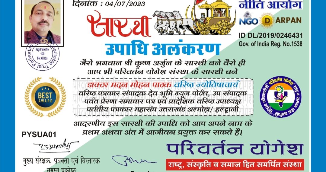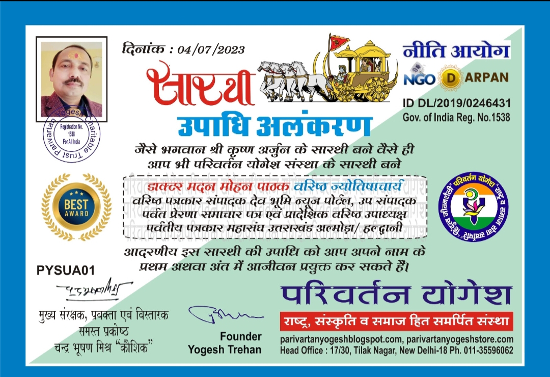 हल्द्वानी /अल्मोड़ा यहां से वरिष्ठ ज्योतिषाचार्य डाक्टर मदन मोहन पाठक को सारथी उपाधि अलंकरण से नवाजा गया है। राष्ट्र,संस्कृति व समाज हित समर्पित संस्था परिवर्तन की ओर से यह सम्मान डां पाठक को उनके द्वारा उत्कृष्ट सामाजिक,धार्मिक तथा ज्योतिषीय कार्य करने पर सम्मानित किया गया। आपको बता दें कि डां पाठक पर्वतीय पत्रकार महासंघ के वरिष्ठ उपाध्यक्ष भी हैं। सदैव ज्योतिषीय,पत्रकारिता,सामाजिक एवं संस्कृतिक कार्य में भी बढ़ चढ़कर प्रतिभाग करते आ रहे हैं। परिवर्तन योगेश