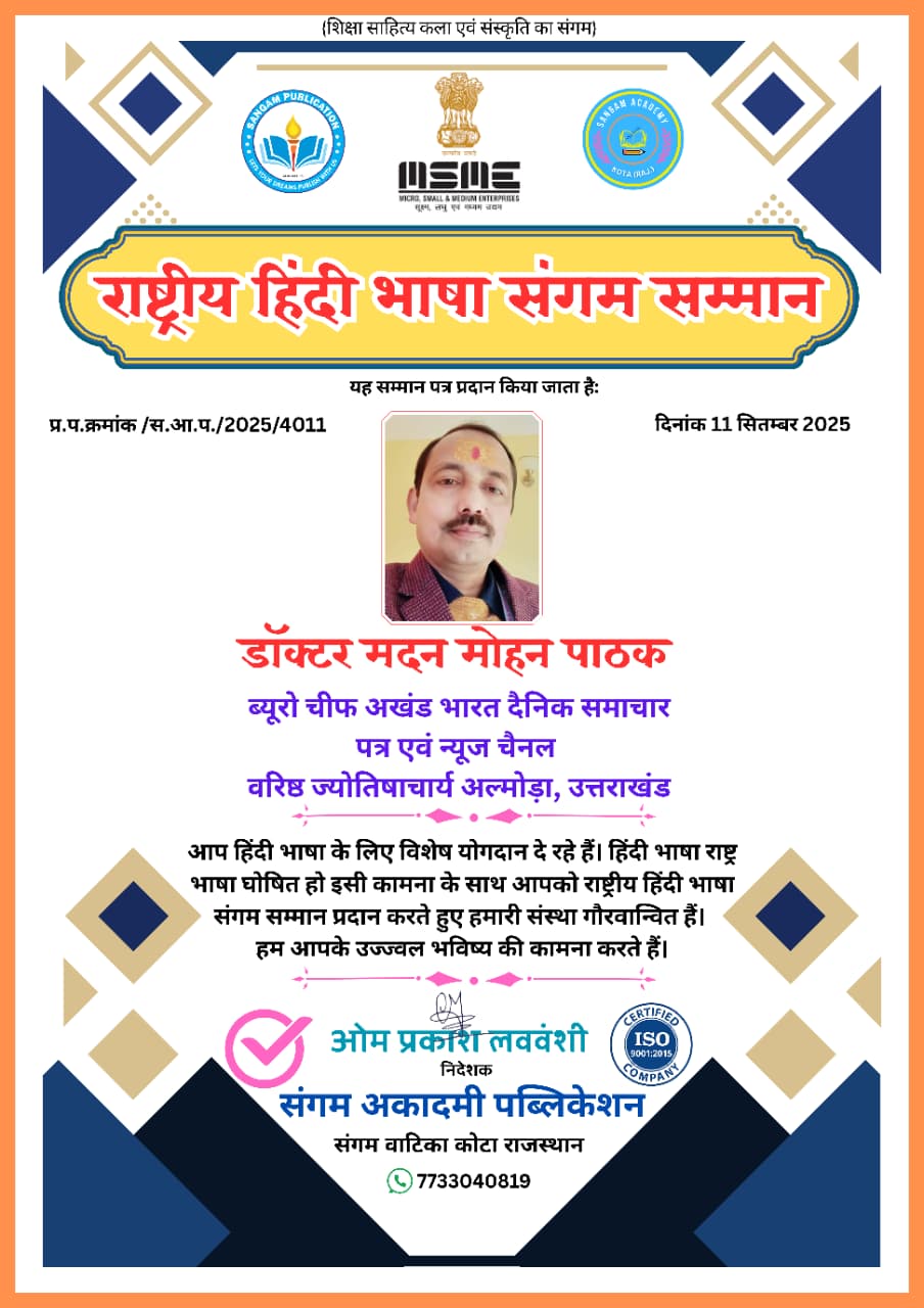 वरिष्ठ ज्योतिषाचार्य एवं अखंड भारत दैनिक समाचार पत्र व न्यूज़ चैनल के ब्यूरो चीफ डॉ. मदन मोहन पाठक को उनके साहित्यिक, पत्रकारिता एवं हिंदी भाषा के प्रति विशेष योगदान के लिए “राष्ट्रीय हिंदी भाषा संगम सम्मान” से नवाजा गया है। यह सम्मान उन्हें शिक्षा साहित्य कला एवं संस्कृति के संगम तथा संगम एकेडमी पब्लिकेशन, कोटा (राजस्थान) की ओर से प्रदान किया गया।