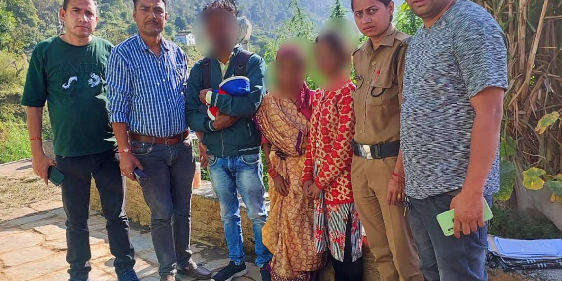 अल्मोड़ा दिनांक 6 अक्टूबर 2023 को थाना लमगड़ा क्षेत्र निवासी एक व्यक्ति द्वारा अपनी पत्नी के एक माह के मासूम पुत्र सहित गुमशुदा होने की सूचना थाना लमगड़ा में दी गई थी। रामचंद्र राजगुरु एसएसपी द्वारा मामले का तत्काल संज्ञान लेकर सीओ अल्मोड़ा, थानाध्यक्ष लमगड़ा व ऑपरेशन स्माइल टीम को गुमशुदा महिला व बच्चे की शीघ्र तलाश करने हेतु निर्देशित किया गया।सीओ अल्मोड़ा विमल प्रसाद के पर्यवेक्षण में अल्मोड़ा पुलिस की ऑपरेशन स्माइल टीम द्वारा सुरागरसी-पतारसी व क्षेत्र में लोगों से जानकारी जुटाकर आज दिनांक 8 अक्टूबर 2023 को गुमशुदा महिला को नन्हे मासूम बच्चे सहित कसार देवी क्षेत्र अल्मोड़ा से सकुशल बरामद किया गया और पति-पत्नी की काउंसलिंग की गई, दोनों को आपसी मतभेदों को भुलाकर साथ रहने के लिए कहा गया।ऑपरेशन स्माइल टीम में