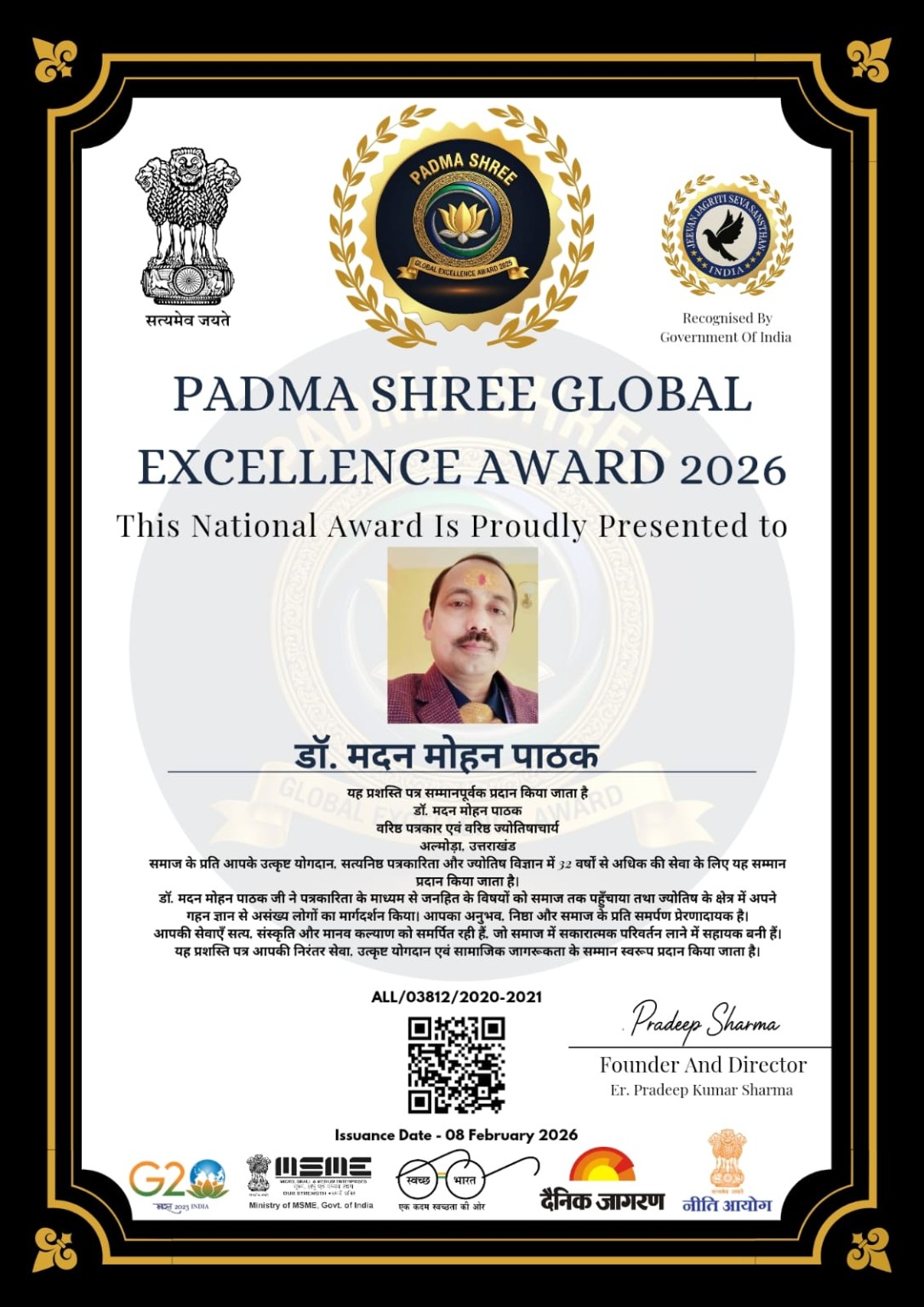 अल्मोड़ा। उत्तराखंड के प्रतिष्ठित वरिष्ठ ज्योतिषाचार्य एवं वरिष्ठ पत्रकार डॉ. मदन मोहन पाठक को उनकी उत्कृष्ट सेवाओं और समाज के प्रति उल्लेखनीय योगदान के लिए “पद्मा श्री ग्लोबल एक्सीलेंस अवॉर्ड 2026” से सम्मानित किया गया है। यह राष्ट्रीय स्तर का सम्मान उन्हें पत्रकारिता, ज्योतिष एवं सामाजिक क्षेत्र में लंबे समय से किए जा रहे महत्वपूर्ण कार्यों के लिए प्रदान किया गया।