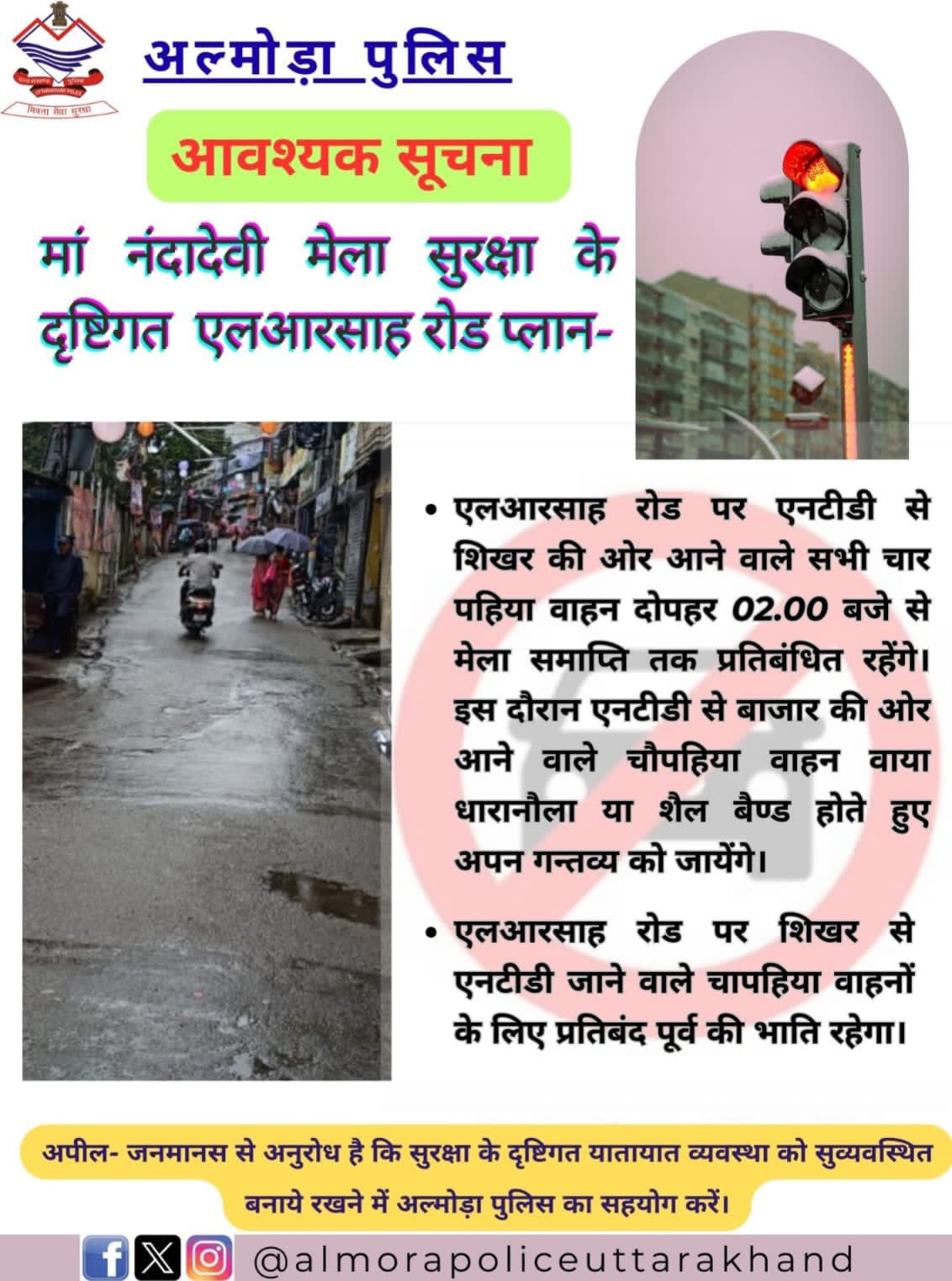 अल्मोड़ा। मां नंदादेवी मेले की सुरक्षा एवं यातायात व्यवस्था को देखते हुए अल्मोड़ा पुलिस ने विशेष यातायात प्लान लागू कर दिया है। पुलिस द्वारा जारी सूचना के अनुसार एलआरसाह रोड पर एनटीडी से शिखर की ओर आने वाले सभी चारपहिया वाहनों का प्रवेश दोपहर 2 बजे से मेला समाप्ति तक पूर्णतः प्रतिबंधित रहेगा।